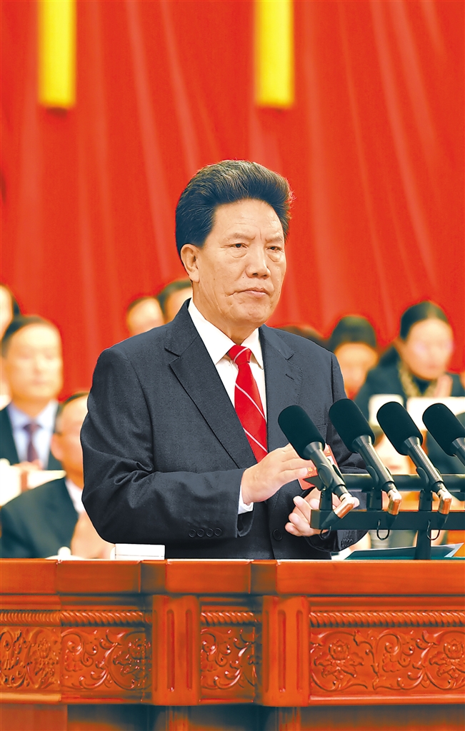 全國(guó)人大常委會(huì)副委員長(zhǎng)、自治區(qū)人大常委會(huì)主任洛桑江村向大會(huì)作自治區(qū)人大常委會(huì)工作報(bào)告。記者 次仁平措 攝