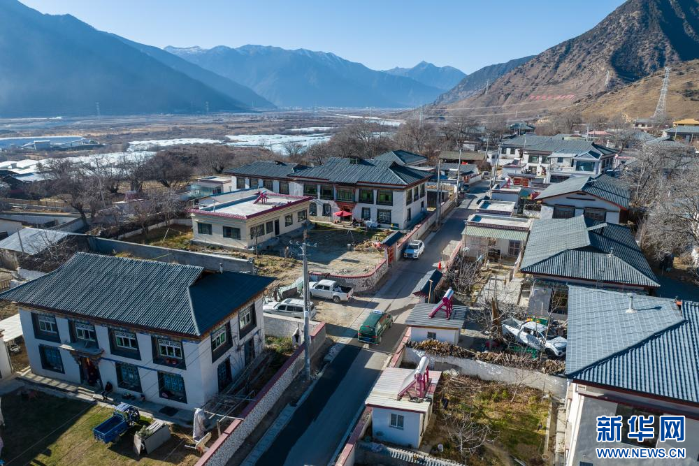 1月19日,西藏林芝市“郵快合作”新配備的郵遞車穿行在鄉(xiāng)村小巷(無(wú)人機(jī)照片)。新華網(wǎng) 旦增努布 攝