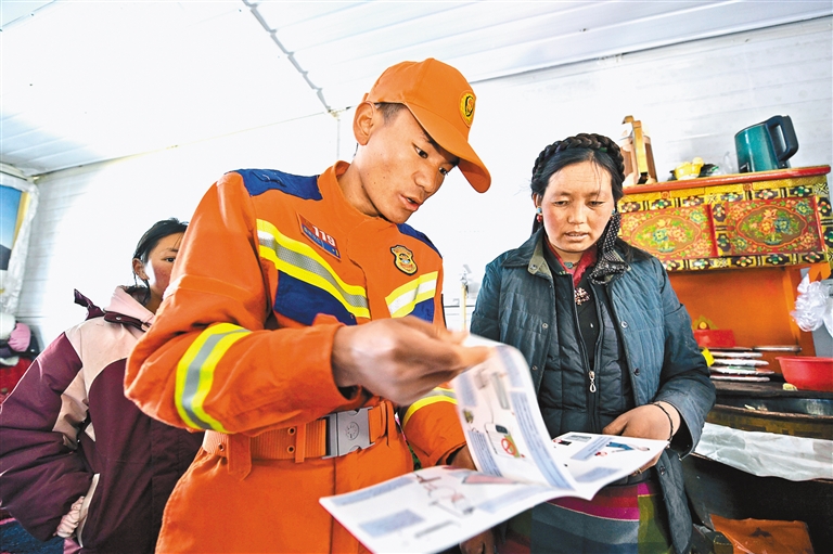 消防員為薩迦縣麻布加鄉(xiāng)普村安置點群眾講解用電和防火知識。記者 唐斌 攝