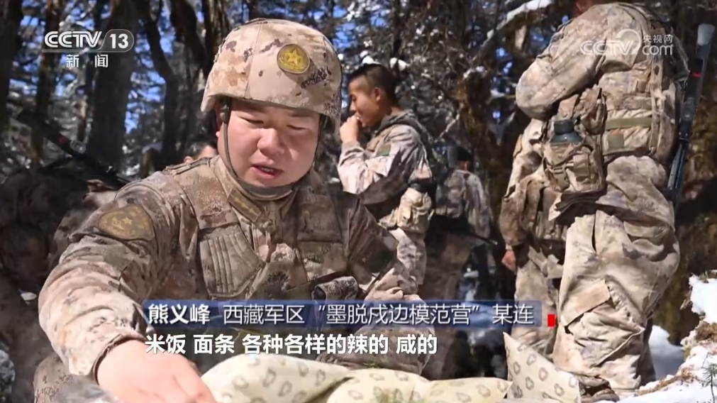 西藏軍區(qū)“墨脫戍邊模范營”某連熊義峰:“我們現(xiàn)在單兵自熱食品品種非常豐富,米飯、面條,各種各樣的,辣的、咸的,能夠滿足廣大官兵的口味需求。然后它的操作也非常簡單,就是加點水,操作非常便捷,熟得也很快,第三個,它這個熱量提供非常充足。因為我們在巡邏路上要經(jīng)常爬山,體力消耗很大,所以需要快速補充能量?!?/p>