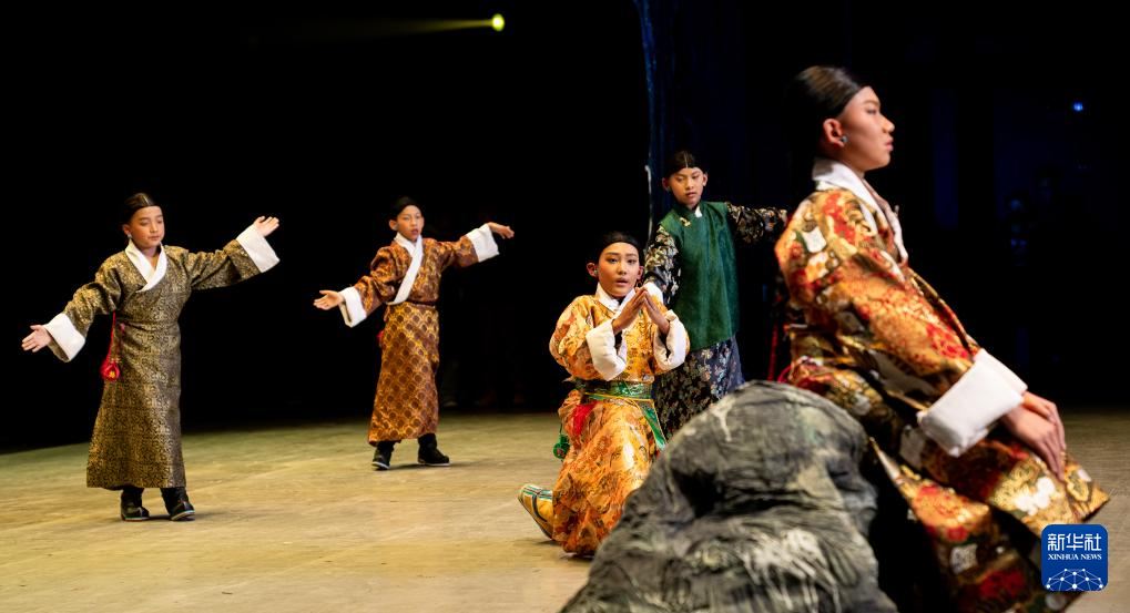 這是西藏首部少兒舞臺(tái)劇藏戲《頓月頓珠》演出現(xiàn)場(chǎng),羅桑朗覺(右三)在劇中飾演“頓月”(2月11日攝)。新華社記者 丁增尼達(dá) 攝