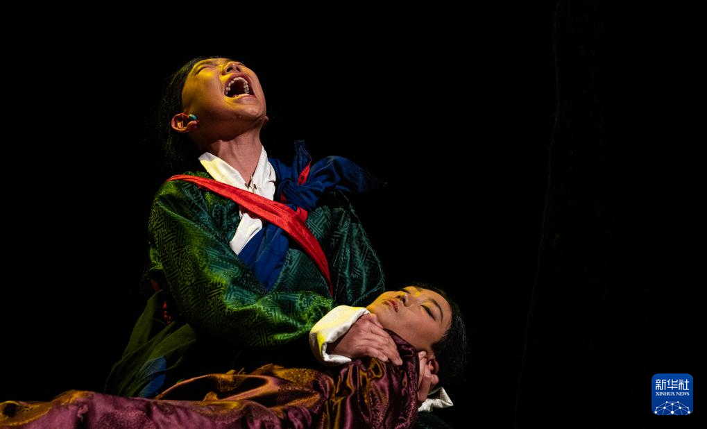 西藏首部少兒舞臺(tái)劇藏戲《頓月頓珠》演出現(xiàn)場(chǎng);羅桑朗覺(右)飾演“頓月”,旦增夢(mèng)朗(左)飾演“頓珠”(2月11日攝)。新華社記者 丁增尼達(dá) 攝