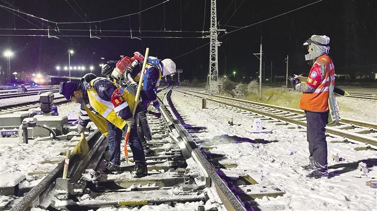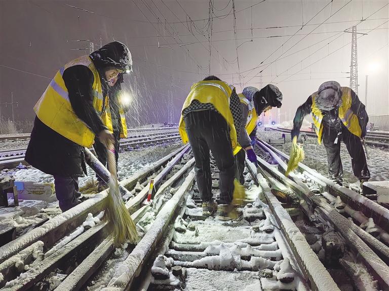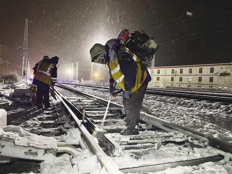 “我們繼續(xù)往前走,檢查下一組道岔?!北M管他們的眉毛、睫毛上都結(jié)滿了冰晶,但這并不能阻擋大家迎戰(zhàn)風(fēng)雪、護(hù)航春運(yùn)的堅(jiān)定步伐。7時30分,經(jīng)過長達(dá)300分鐘緊張有序的作業(yè),拉薩西貨場道岔積雪終于清理完畢。