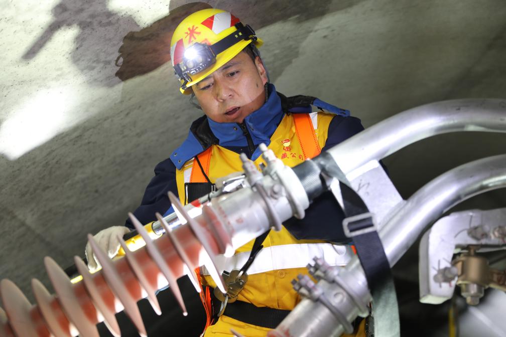 春運期間,接觸網工人劉海軍在拉林鐵路色拉丘隧道內為接觸網更換絕緣子。(拉巴次仁攝)