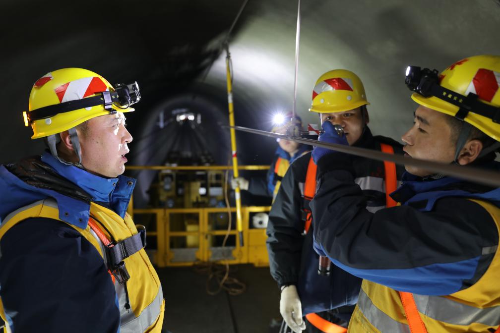 春運期間,接觸網工人劉海軍(左)和王有壽(右)在拉林鐵路色拉丘隧道內為接觸網加固吊弦。(拉巴次仁攝)