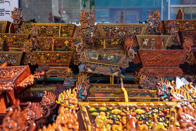 “老板,這個(gè)切瑪盒多少錢?便宜點(diǎn)我就拿走了。”“這個(gè)圖案樣式都是精心雕刻的,最低1300元,實(shí)在不能再少了?!贝稳实牡赇伹埃簧兕櫩驼谔暨x“切瑪盒”,生意很是火爆?!扒鞋敽小笔菍⒕贫沸文竞杏酶舭宸珠_,左右兩邊分別盛入炒青稞和糌粑,再插上象征五谷豐登的“羅薩梅朵”和寓意吉祥的酥油花,寓意人壽年豐、吉祥如意,是藏歷新年家家戶戶必備的年貨之一。次仁告訴記者,“切瑪盒”根據(jù)圖案、顏料、大小、木材等因素,售價(jià)從幾百元到上千元不等,很多顧客普遍喜愛傳統(tǒng)樣式與圖案。