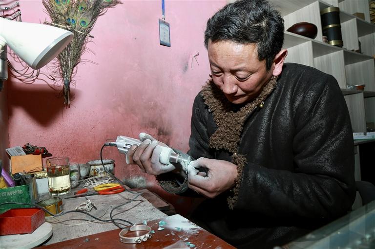 此時,一位顧客走進店內:“你好,我現(xiàn)在定做阿吉祖玉首飾大概什么時候能完成呀?”顧客滿懷期待地問道?!艾F(xiàn)在訂單比較多,不過您放心,在藏歷新年前肯定能完成?!贝窝攵嗉獰崆榈鼗貞馈?/p>