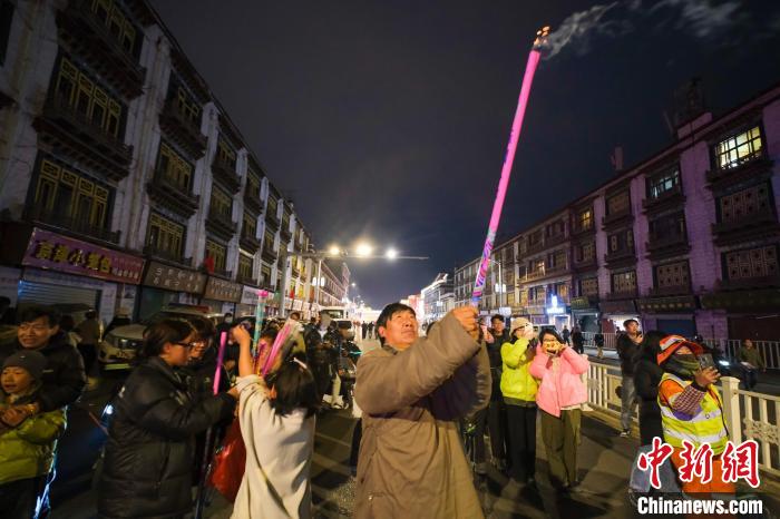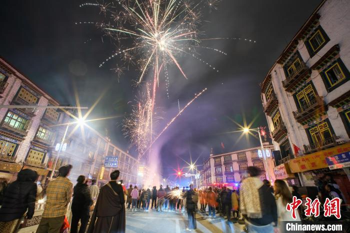 藏歷新年是西藏傳統(tǒng)民俗活動,也是中國國家級非物質(zhì)文化遺產(chǎn)。2月27日,西藏迎來一年一度的藏歷新年古突夜(類似春節(jié)的除夕),如今過古突夜,西藏民眾在點燃火把的同時,也會燃放煙花,古城拉薩煙花璀璨。圖為2月27日晚,拉薩當?shù)孛癖娕c游客等在街頭共同慶祝藏歷木蛇新年的到來。中新社記者 江飛波 攝