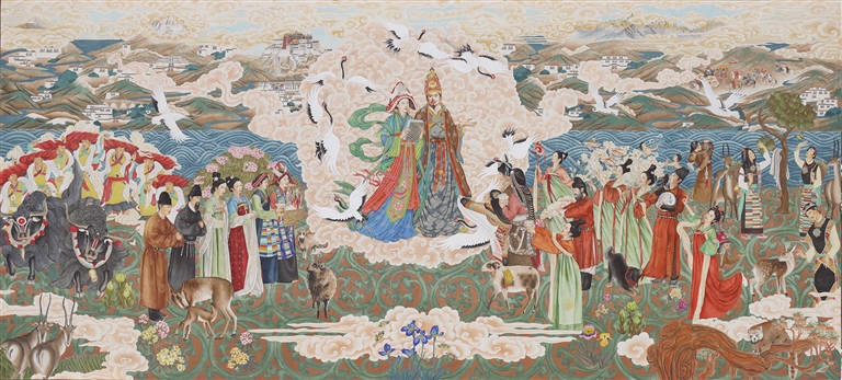 西藏的年畫起步較晚,但此次展覽卻給這一傳統(tǒng)藝術(shù)帶來了全新的發(fā)展契機(jī)。“新生活·新風(fēng)尚·新年畫”展覽負(fù)責(zé)人扎西諾布介紹,展覽共展出近100幅作品,來自97位藝術(shù)家。不同地域的風(fēng)格在這方展廳中碰撞、交融,江南水鄉(xiāng)的溫婉細(xì)膩、巴蜀大地的熱情奔放、湘楚文化的靈動飄逸、青藏高原的粗獷豪邁,都通過一幅幅年畫展現(xiàn)得淋漓盡致。