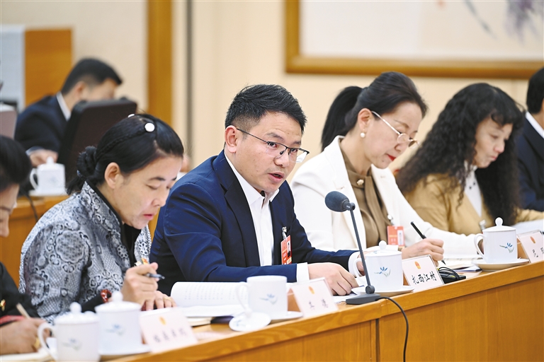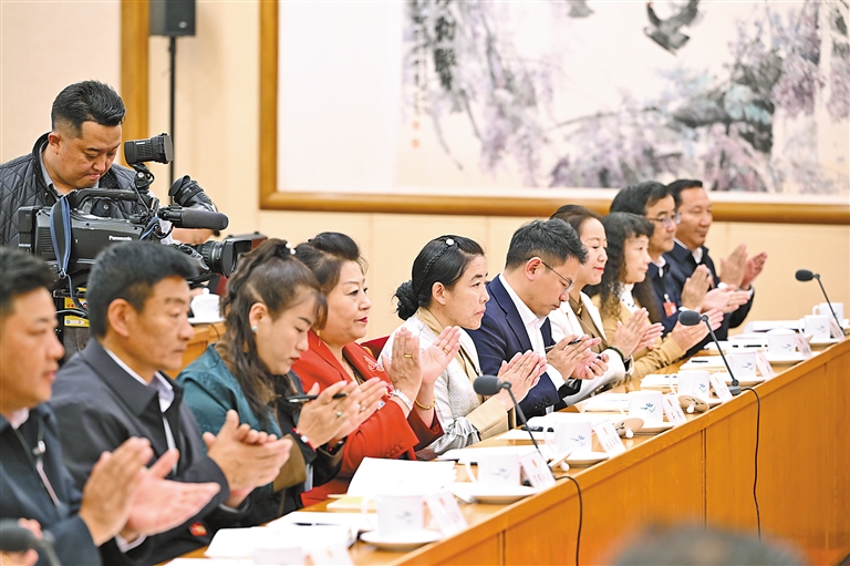 西藏全國人大代表扎西江村(中)在西藏代表團全體會議上發(fā)言。