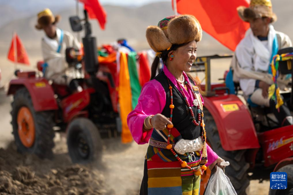 儀式現(xiàn)場(chǎng),38臺(tái)農(nóng)用拖拉機(jī)整齊停放。11時(shí)許,在眾人的祈福聲中,清一色身著白色氆氌藏裝、頭戴長(zhǎng)壽金絲帽的拖拉機(jī)手把拖拉機(jī)開(kāi)進(jìn)農(nóng)田,機(jī)身后掛的銀色犁頭刨開(kāi)沉睡了一整個(gè)寒冬的沃土,盛裝的婦女們緊隨拖拉機(jī),播撒希望的種子。