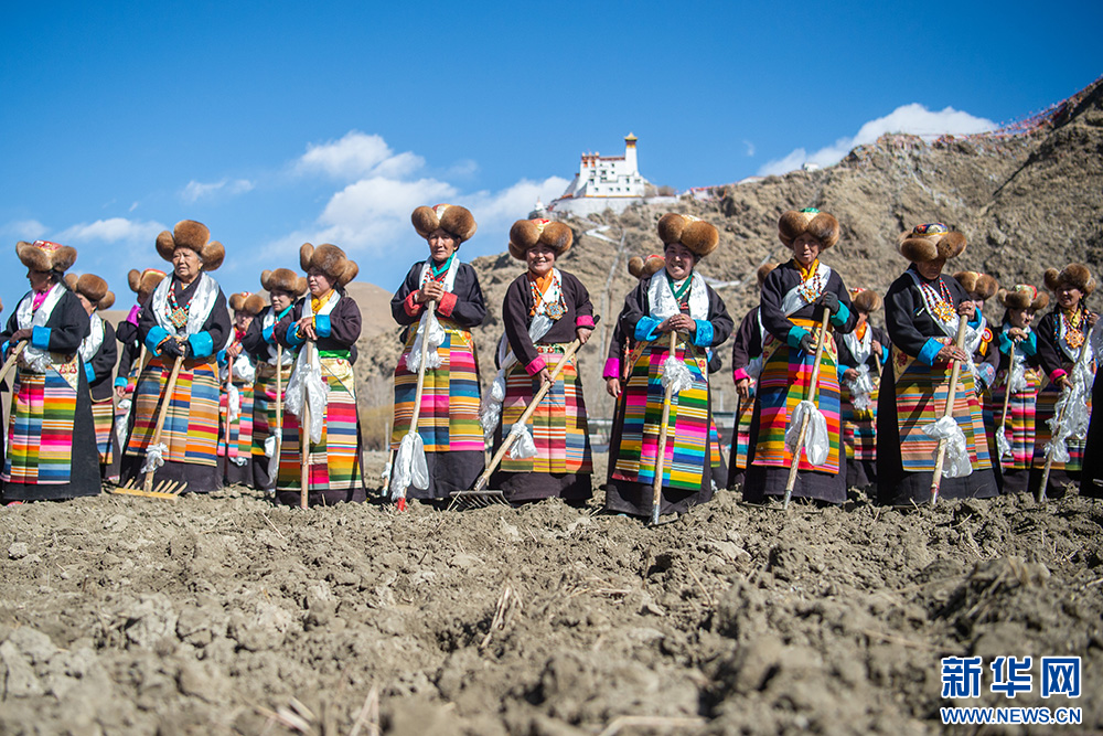 16日,西藏山南市乃東區(qū)門(mén)中崗社區(qū)的群眾按照傳統(tǒng)儀式,身著盛裝,手捧青稞酒,在雍布拉康宮殿腳下的西藏“第一塊農(nóng)田”舉行春耕儀式,播撒今春第一粒種子。