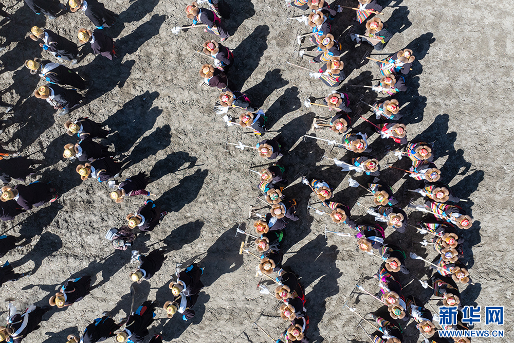 圖為西藏山南市乃東區(qū)門(mén)中崗社區(qū)春耕儀式現(xiàn)場(chǎng)(3月16日攝,無(wú)人機(jī)照片)。新華網(wǎng) 旦增努布 攝