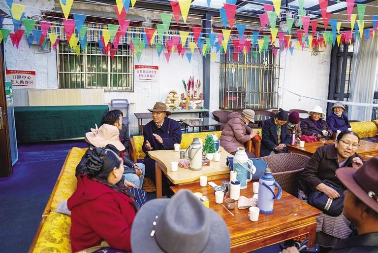 1956年出生的赤來,是策門林老年日間照料中心的??停屠习榫幼≡诶_市城關(guān)區(qū)八朗學(xué)社區(qū),已在拉薩生活了30多年。回憶起過去的歲月,赤來感慨萬千:“聽我爺爺奶奶說,以前的生活真的很苦,我們住在帳篷里,靠放牧為生,經(jīng)常挨餓受凍?,F(xiàn)在黨和政府的政策好,我們的生活發(fā)生了翻天覆地的變化?!闭勂鹑缃竦纳钭兓鄟碚J(rèn)為最直觀、最明顯的就是住房條件的改善,“我的老家在那曲,那里海拔高、氣候寒冷,到了冬天,寒風(fēng)會灌進帳篷,大家凍得直打哆嗦。那時候,能有個不漏風(fēng)的帳篷住就不錯了,哪里敢奢望現(xiàn)在這樣的生活?!?/p>