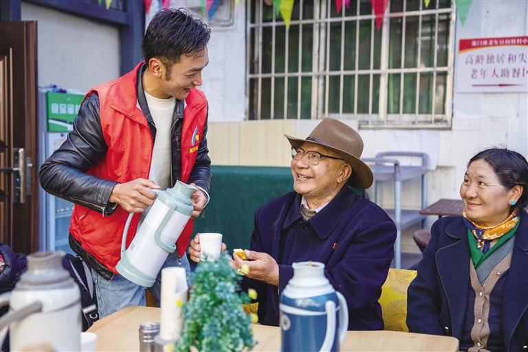 “波啦,您來啦,快坐下來喝點熱茶?!薄澳?,待會午飯在這邊吃嗎?”近日,記者來到拉薩市城關(guān)區(qū)蕃陽社會工作者和志愿者服務(wù)協(xié)會下的策門林老年日間照料中心,剛進大門就被一群正在鍛煉身體的老人所吸引。他們跟著老師抬手、踢腿、扭腰,動作整齊劃一,臉上洋溢著幸福的笑容。鍛煉結(jié)束后,赤來回到助餐區(qū),邊喝甜茶邊吃“卡賽”,和老人們分享趣聞,拉著家常,現(xiàn)場傳來一陣陣歡聲笑語。