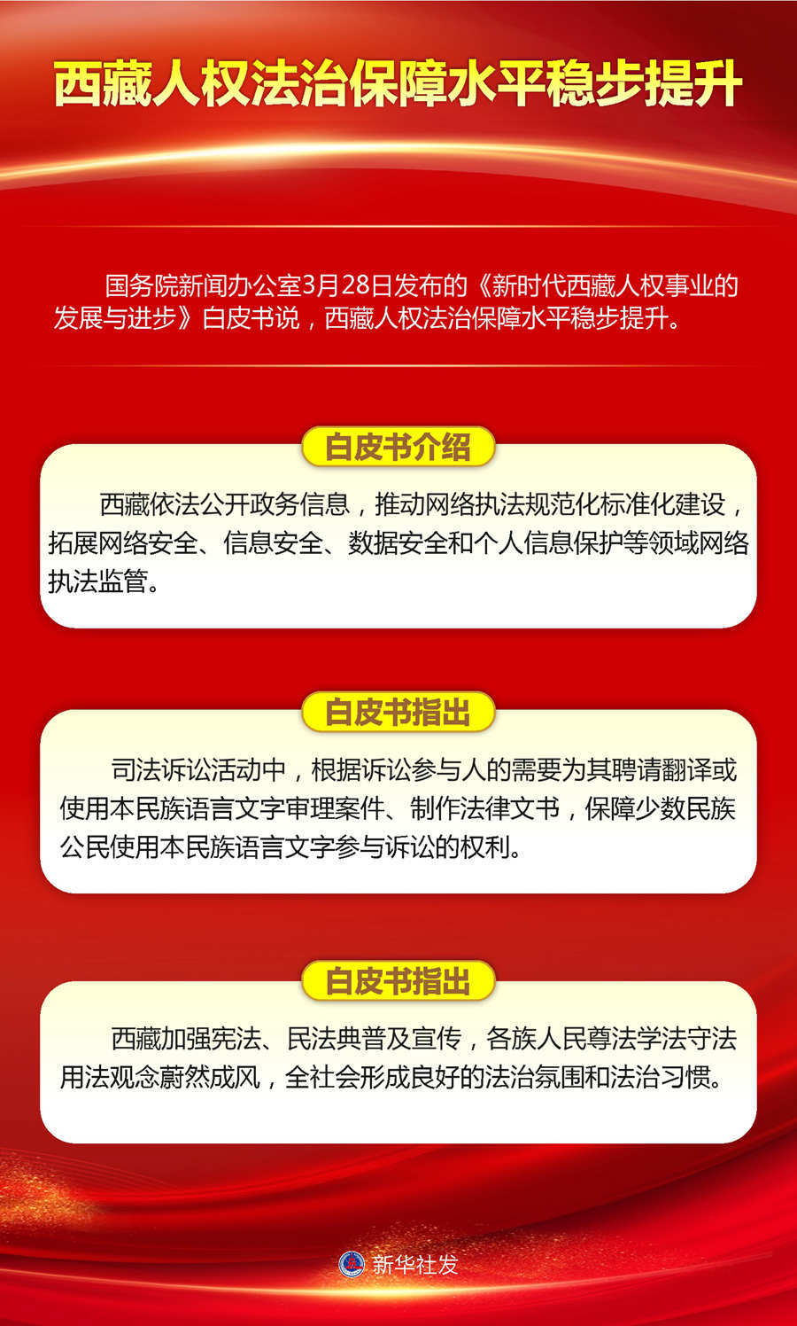 國務院新聞辦公室28日發(fā)布的《新時代西藏人權事業(yè)的發(fā)展與進步》白皮書說,西藏人權法治保障水平穩(wěn)步提升。