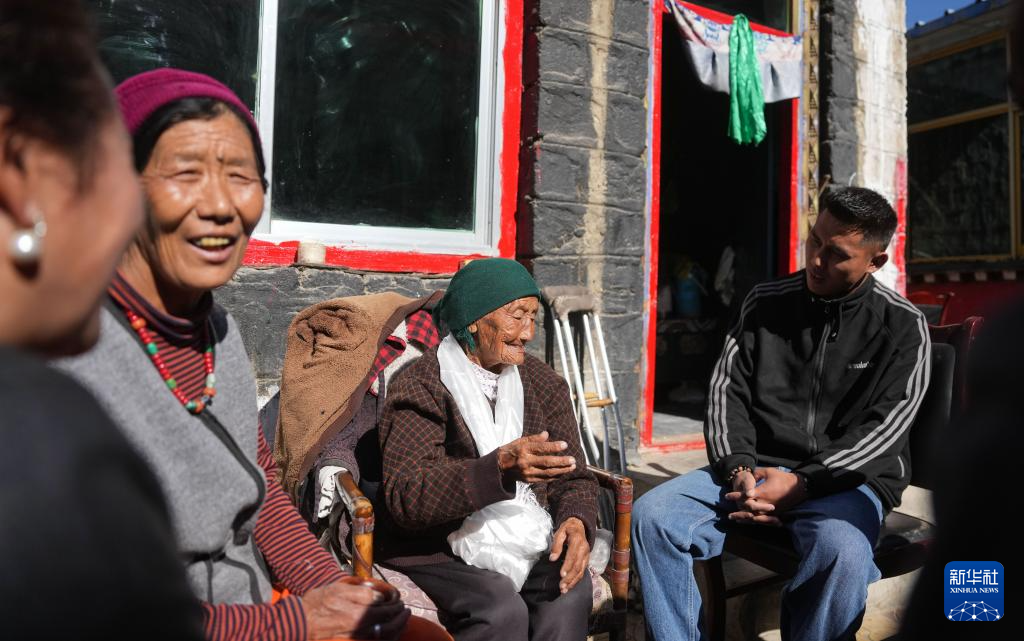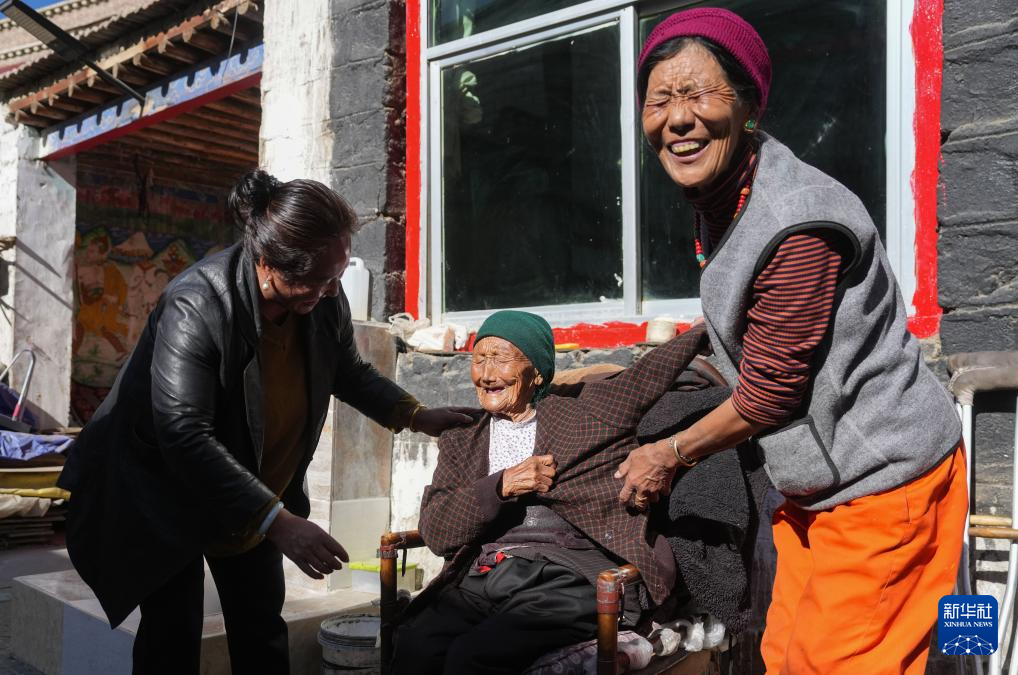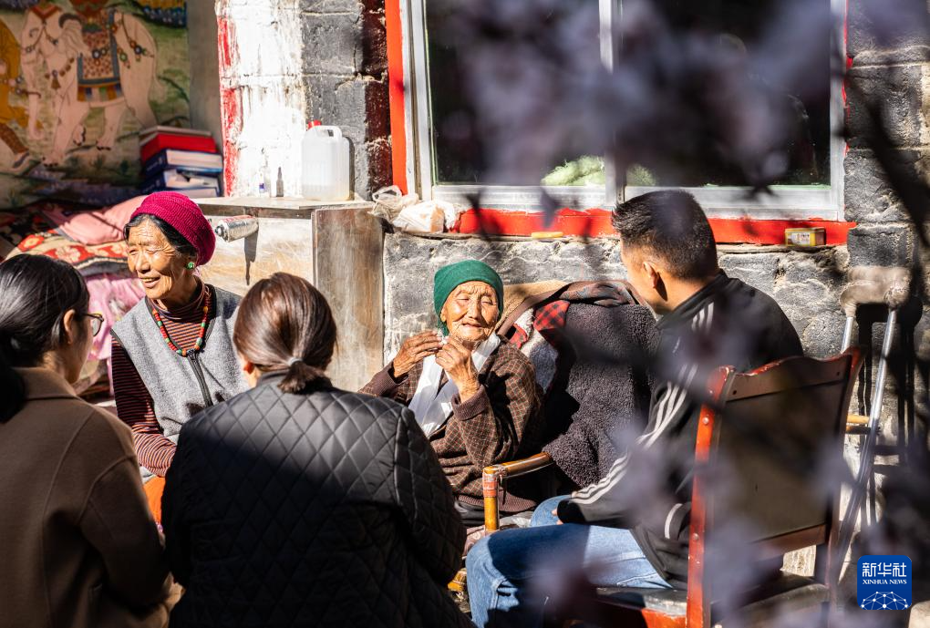 某朗桑姆(中)跟女兒及街坊開玩笑(3月20日攝)。新華社記者 晉美多吉 攝