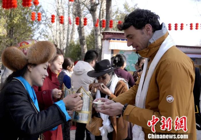 2025年2月28日是2025年藏歷木蛇新年的第一天。圖為外國(guó)游客在西藏拉薩市羅布林卡內(nèi)品嘗青稞酒。中新社記者 李林 攝