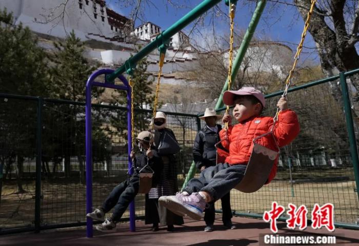 2025年3月13日,小朋友在西藏拉薩宗角祿康公園蕩秋千。坐落于布達(dá)拉宮腳下的宗角祿康公園是拉薩民眾戶(hù)外活動(dòng)的一大場(chǎng)所。中新社記者 李林 攝