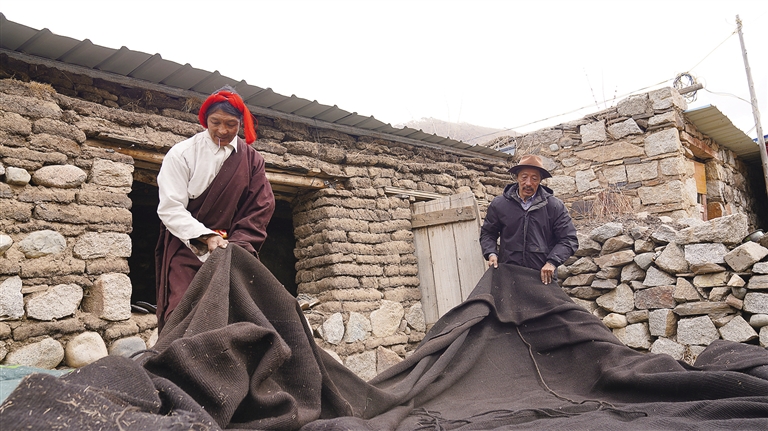 羅桑檢查縫制好的黑帳篷。