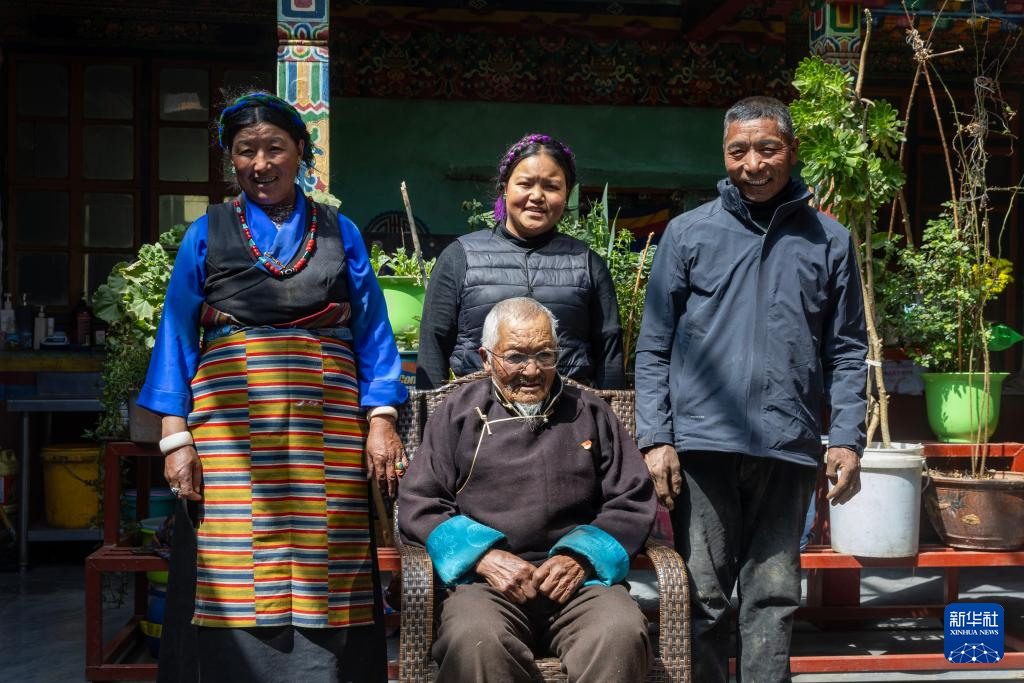 普瓊老人(前)與兒子歐珠(后右一)、兒媳曲宗(后右三)、孫女其美拉姆在家中合影(3月17日攝)。新華社記者 姜帆 攝