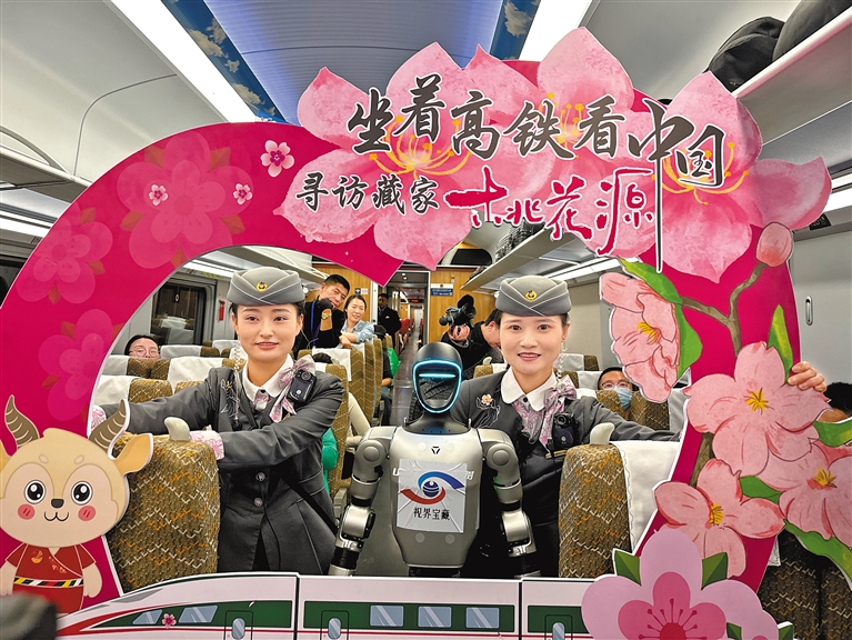 圖為拉林鐵路復(fù)興號動車組乘務(wù)員與機器人多吉合影。記者 文鳳 通訊員 馬生明 攝