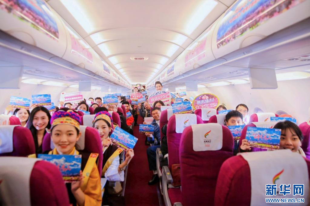 在首航旅途中,航班以“林芝桃花”為主題,載著來(lái)自全國(guó)各地的林芝“醉”美戀人、文旅達(dá)人、媒體代表及游客等100余人,開(kāi)展了派發(fā)林芝來(lái)信、情侶云端告白、情歌合唱、首航蛋糕慶祝儀式等精彩互動(dòng)環(huán)節(jié),并通過(guò)桃花仙子云端文旅推介讓嘉賓和游客們對(duì)林芝滿(mǎn)懷憧憬。
