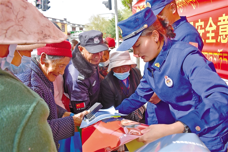 4月15日,山南市瓊結(jié)縣組織開展第十個全民國家安全教育日系列宣傳活動。圖為瓊結(jié)縣消防救援大隊工作人員向群眾發(fā)放宣傳資料。記者 孫開遠(yuǎn) 攝