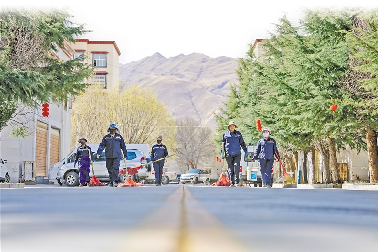 物業(yè)服務(wù)部保潔團隊在清掃小區(qū)道路。記者 阿旺尼瑪 攝