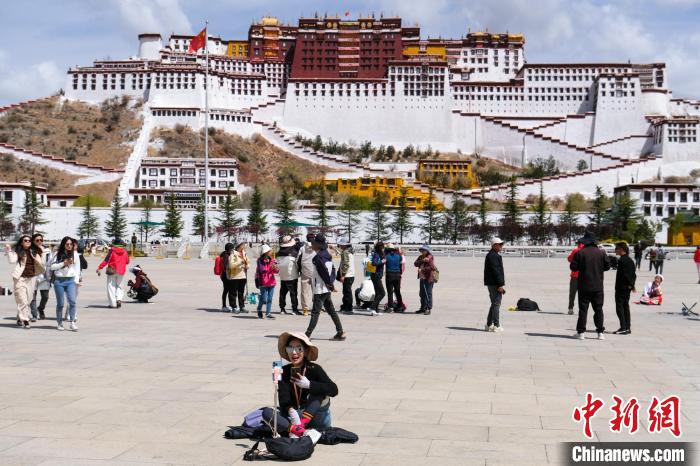 圖為4月18日,一位視頻博主在拉薩布達拉宮廣場直播,其身后為游客在拍照“打卡”。江飛波 攝