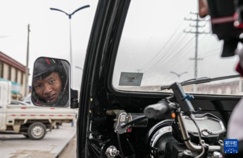 拉巴準(zhǔn)備去派件,他通過后視鏡檢查路況(4月24日攝)。新華社記者 晉美多吉 攝