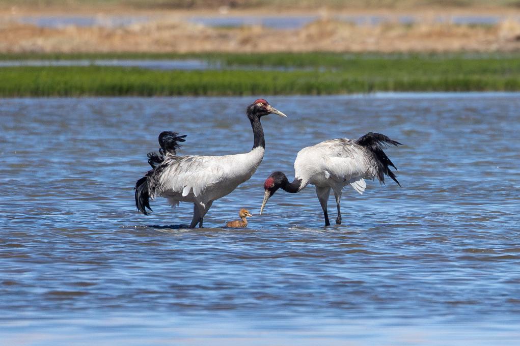 2024年6月9日,一對(duì)黑頸鶴帶著雛鳥(niǎo)在西藏那曲市申扎縣一處濕地棲息、覓食。新華社記者 旦增尼瑪曲珠 攝