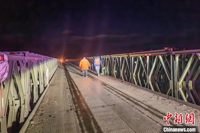 圖為5月12日凌晨地震后,養(yǎng)護人員對拉孜雅魯藏布江臨時保通鋼架橋進行檢查。西藏自治區(qū)交通運輸廳 供圖