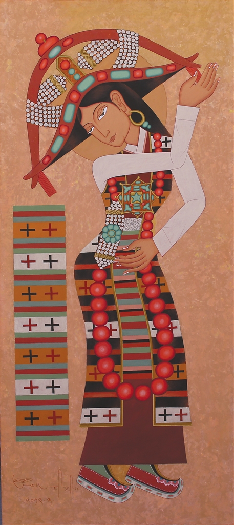 在昂?!皞鹘y(tǒng)當隨時代”的藝術(shù)理念浸潤下,徒弟們總能在傳統(tǒng)與當代的碰撞中找到獨特的表達坐標:來自日喀則的藝術(shù)家多吉次旺,早年被昂桑畫作中藏文元素與抽象色塊的融合所震撼。如今在拉薩創(chuàng)辦工作室的他,正將藏文書法的中鋒筆觸解構(gòu)為流動的視覺符號——烏金體的頓挫韻律幻化為色彩的潮涌,在畫布上重現(xiàn)古老史詩的“當代心跳”;而主演《文成公主》實景劇的馮佳,這位四川傳媒大學(xué)表演系的畢業(yè)生,跟隨昂桑學(xué)畫四年,已能在《文成公主》系列中將唐卡礦物顏料的莊重與波普藝術(shù)的色塊切割并置,讓歷史人物既保有壁畫般的莊重感,又流淌著屬于時代的視覺節(jié)奏。