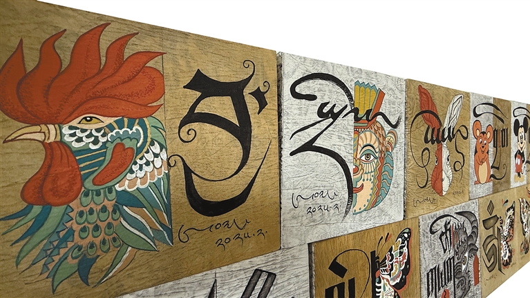 在昂桑的工作室中,《一日一畫》系列尤為醒目:藝術(shù)家采用布面重彩技法,讓唐卡礦物顏料與現(xiàn)代丙烯顏料滲透交融,傳統(tǒng)吉祥紋樣與幾何抽象圖案共生。韓書力評價:“他讓千年顏料與當代審美共振,完成傳統(tǒng)藝術(shù)的‘基因重組’。”