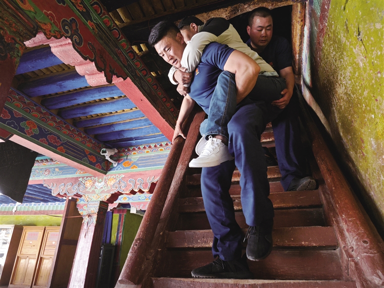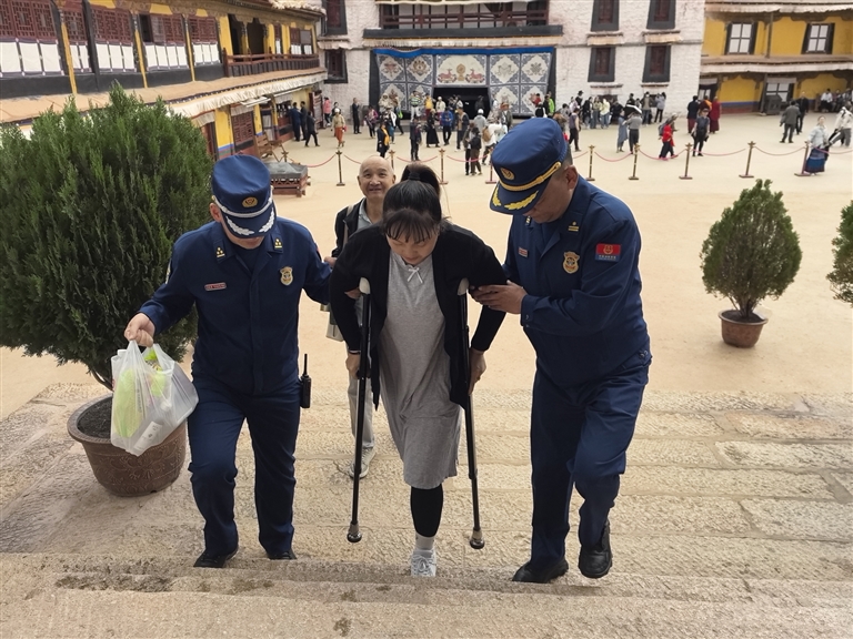 2024年,消防救援站接到一項(xiàng)特殊任務(wù)——幫助19名來(lái)自四川的殘疾人士參觀布達(dá)拉宮。面對(duì)15位肢體殘疾人和4位視力殘疾人,尤其是6位重度輪椅使用者和2位全盲者,消防員們沒(méi)有絲毫猶豫接下任務(wù)。布達(dá)拉宮海拔高、樓梯多、內(nèi)部道路狹窄陡峭,消防員們就用擔(dān)架抬、輪流背的方式帶領(lǐng)他們游覽。同時(shí),消防員化身“導(dǎo)游”,每到一處都詳細(xì)講解布達(dá)拉宮的歷史文化,耐心解答疑問(wèn),讓這些特殊游客感受到了溫暖與尊重。