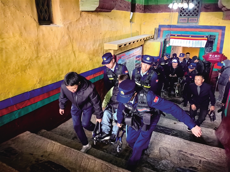 消防員幫助殘疾人士參觀布達(dá)拉宮。圖由拉薩市布達(dá)拉宮消防救援站提供