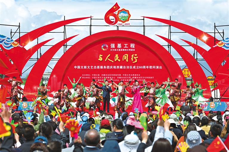 上午10時整,“與人民同行”中國文聯(lián)文藝志愿服務(wù)團(tuán)慶祝西藏自治區(qū)成立60周年慰問演出,在歌舞《鼓舞西藏》的熱烈氛圍中正式開場。