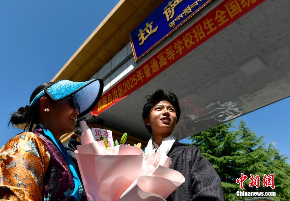 6月9日,西藏拉薩江蘇實驗中學考點外親友為考生送上哈達。當日,西藏自治區(qū)2025年普通高考完成所有科目考試,2025年西藏高考落下帷幕。中新社記者 貢嘎來松 攝