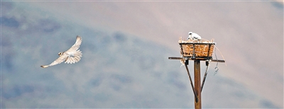 一只游隼飛離鷹架上的巢。新華社記者 姜 帆攝