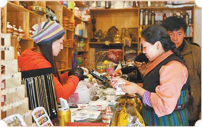 游客在吉隆鎮(zhèn)吉甫村購(gòu)買當(dāng)?shù)靥厣唐贰@妥诩獢z