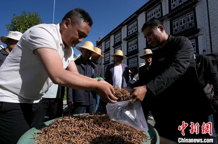 圖為6月13日,蟲(chóng)草商通過(guò)揣袖議價(jià)的方式購(gòu)買(mǎi)冬蟲(chóng)夏草。中新社記者 李林 攝