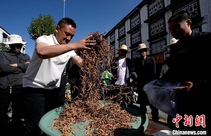 冬蟲(chóng)夏草(簡(jiǎn)稱(chēng)“蟲(chóng)草”)是一種名貴中藥材,素有“軟黃金”之稱(chēng)。隨著蟲(chóng)草的大批量上市,西藏拉薩最大的蟲(chóng)草交易市場(chǎng)清真寺蟲(chóng)草交易火爆,蟲(chóng)草商們忙著進(jìn)行交易。圖為6月13日,蟲(chóng)草商們挑選蟲(chóng)草。中新社記者 李林 攝
