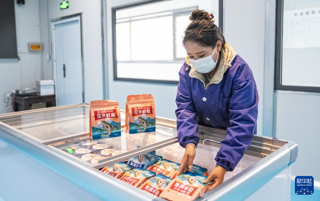 工作人員在車(chē)間內(nèi)將亞?wèn)|鮭魚(yú)的加工產(chǎn)品放入冷藏柜(6月19日攝)。新華社記者 丁增尼達(dá) 攝