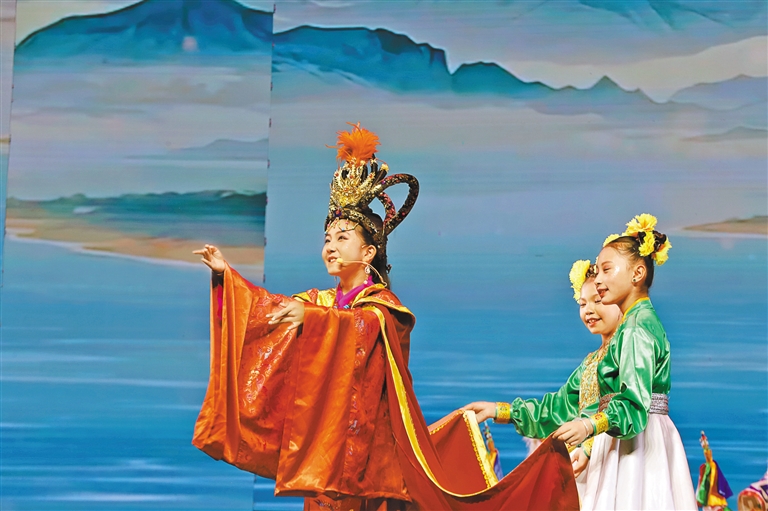 舞臺(tái)中央,12歲的其美卓嘎身著錦繡華服,以清亮唱腔和靈動(dòng)演繹,將文成公主的溫婉堅(jiān)毅展現(xiàn)得淋漓盡致?!爱?dāng)我穿上戲服、唱起‘漢藏情誼潔如璧’時(shí),仿佛真的穿越到千年前的和親之路。”演出結(jié)束后,小姑娘眼中閃爍著興奮的光芒,“原來民族團(tuán)結(jié)的故事,就藏在這些古老而動(dòng)人的戲文里?!逼涓赣H倫珠難掩自豪:“文成公主促進(jìn)了漢藏交融,女兒能表演這個(gè)節(jié)目,用藏戲詮釋民族團(tuán)結(jié),是我們?nèi)业尿湴粒 ?/p>