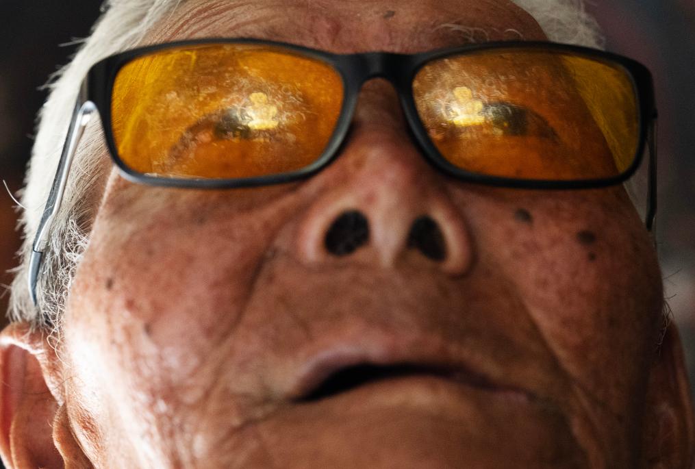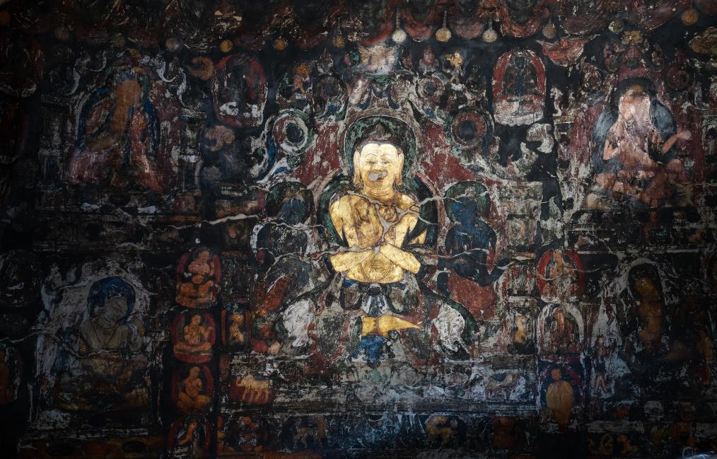 2023年5月26日,仁增旺扎在觀看石窟里的壁畫時,一幅金色的佛像壁畫映在他的眼鏡上。