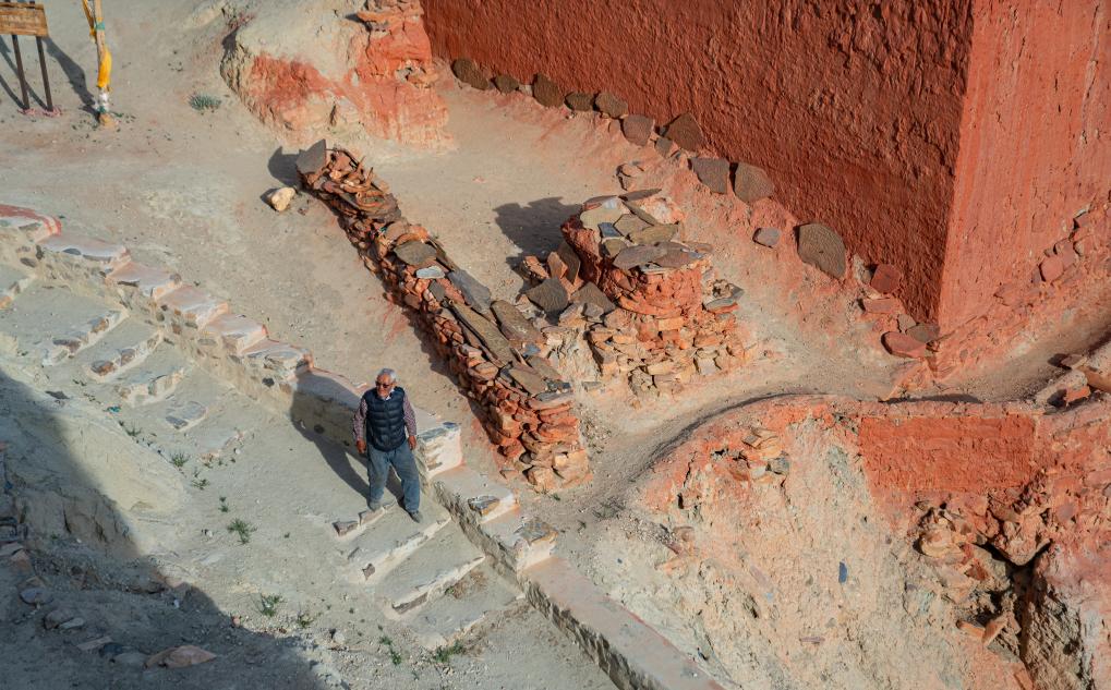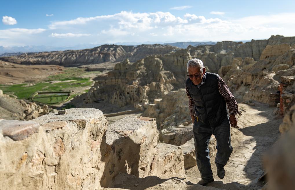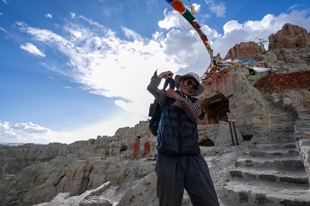 仁增旺扎巡查各個石窟,這是他多年來的習慣(2023年5月26日攝)。