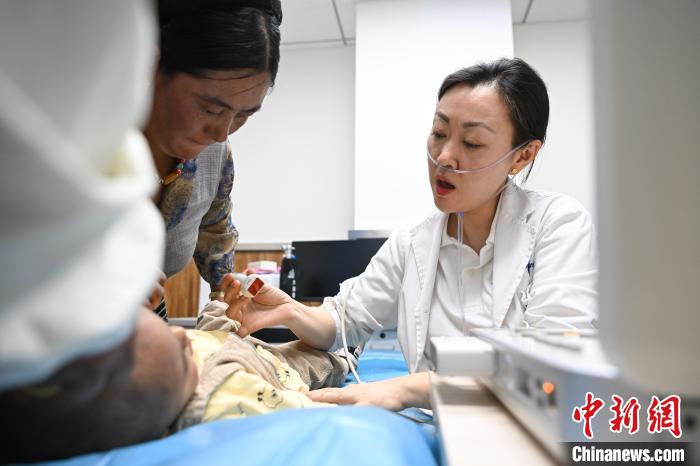 圖為醫(yī)療專家為患兒檢測血氧。 中新社記者 貢嘎來松 攝