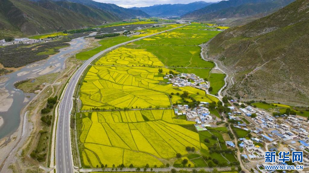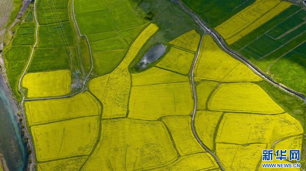圖為7月2日拍攝的俯瞰墨竹工卡縣扎西崗鄉(xiāng)加爾多村油菜花田(無(wú)人機(jī)照片)。新華網(wǎng)發(fā) 洛克 攝