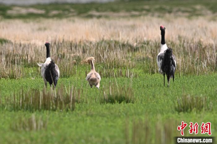 7月10日,在海拔4700米的西藏自治區(qū)那曲市申扎縣濕地里,黑頸鶴一家在悠閑覓食。中新社記者 貢嘎來松 攝